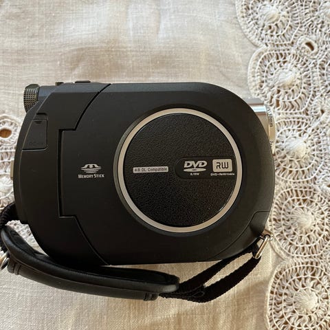 Sony Handycam videokamera i sølvfarge. Kompakt digitalt videokamera med utfellbar LCD-skjerm og håndrem på siden for stabilt grep. Leveres med original eske, strømadapter/lader, fjernkontroll, skulderrem og bruksanvisning.