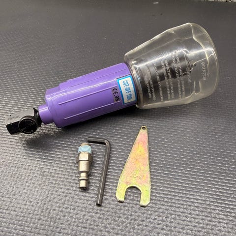 Rett trykkluftdrevet slipemaskin/kutteverktøy med beskyttelsesskjerm, beregnet for mindre slipe- og kuttejobber i metall. Passer til standard trykkluftkobling og tar vanlige små skiver/freser. Kompakt og lett å håndtere i trange områder.