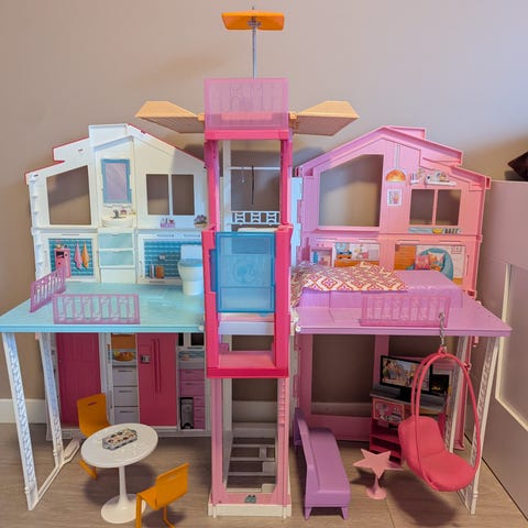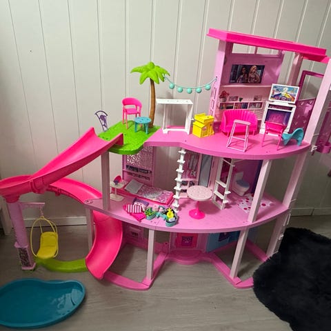 Barbie dukkehus med flere etasjer i hovedsak rosa plast. Huset har åpen front og flere rom, blant annet stue, kjøkken, bad og soverom. Det følger med stor rød sklie som går fra øverste etasje og ned til et blått basseng, samt en gul huske festet i egen søyle. På takterrassen er det palme, liten sklie og utemøbler. Må hente