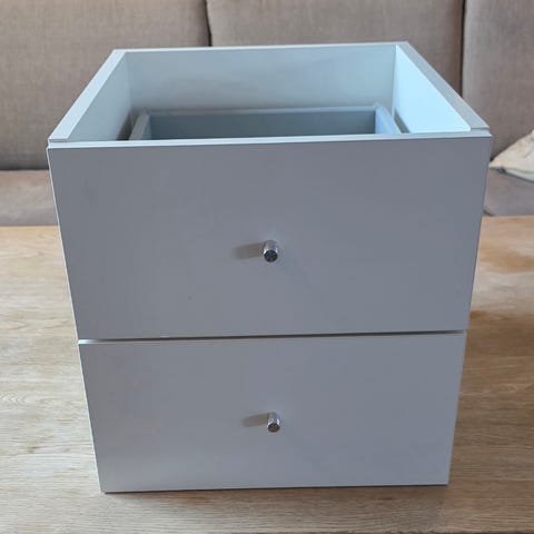 Selger en liten vegghengt nattbord, hvitlakkert, vi kjøpte for et par år siden hos Skeidar.