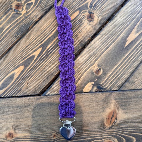Heklet smokkelenke i oeko tex 100% bomullsgarn. Lenken har mønsterheklet bånd og klype for feste i klær. Passer til å holde smokk på plass og redusere risiko for at smokken faller i bakken eller blir borte.