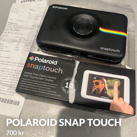 Polaroid Snap instantkamera i hvit farge. Kameraet kombinerer digital fotografering med umiddelbar utskrift på fotopapir direkte fra kameraet. Egnet for enkel og rask fotografering der bildene kan skrives ut med en gang. Passer til hverdagsbruk, reiser og sosiale sammenhenger der man ønsker fysiske bilder med en gang de er tatt.