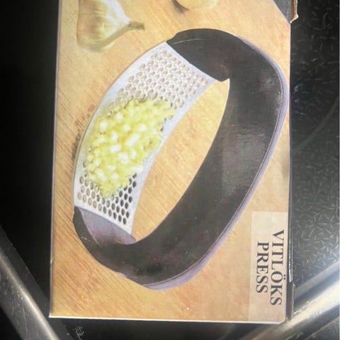 Redskapet har flere parallelle ståltenner som holder løken eller andre råvarer på plass under kutting. Håndtaket er utformet for å gi et fast grep. Kan brukes til å lage jevne skiver av løk og andre grønnsaker, og til å holde kjøtt eller fisk stabilt ved oppdeling. Laget i rustfritt stål med plastgrep!