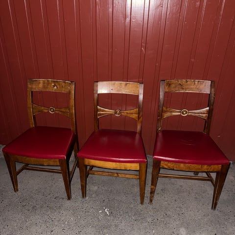 Det følger med 8 stoler. Disse kan lett trekkes om.