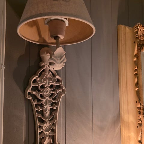 Fin offwhite bordlampe som har et dekorativt bladmønster.