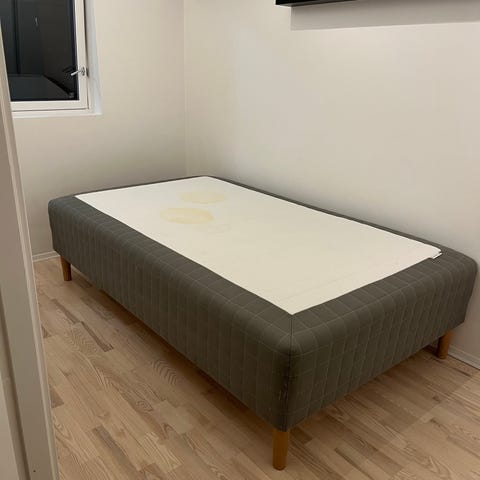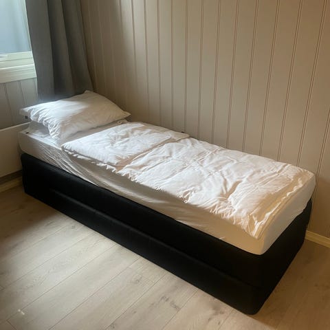 IKEA enkeltseng i metall med rette sengehester ved hode- og fotende. Sengen har en enkel madrass og passer som enkeltseng på soverom, gjesterom eller hytte. Nøytralt uttrykk som gjør den lett å plassere i ulike typer innredning.Bredde 90 cm