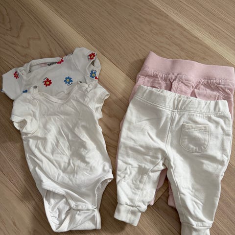 Selger en liten klespakke med tre bukser, tre bodyer, en kjole og en cardigan. Størrelse 62-68