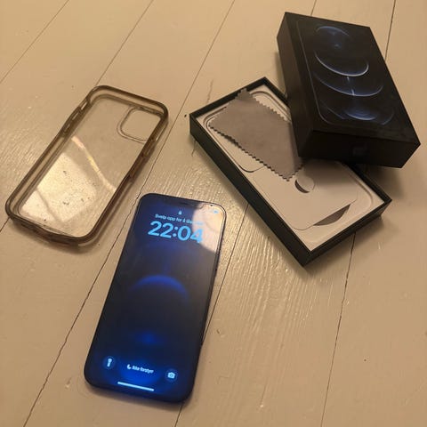 Telefonen har dobbelttkamera på baksiden og skjerm med heldekkende design og Face ID. Lagringskapasiteten på 128 GB gir plass til apper, bilder, video og andre filer. En av bildene viser batteritilstand på 85 % maksimal kapasitet på tidspunktet skjermbildet ble tatt.