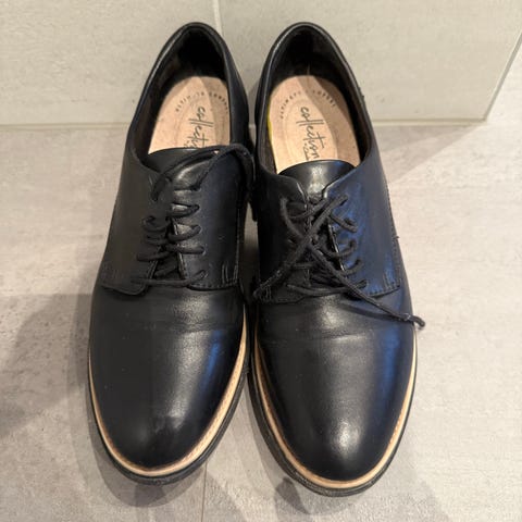 Clarks mokkasiner i størrelse 40 for dame. Skoene er laget i svart skinn med myk innersåle og gummisåle med riller for bedre grep. Klassisk penny-loafer-design egnet til hverdagsbruk og kontor. Passer til bruk med bukser, skjørt og kjoler der en enkel og nøytral sko ønskes.