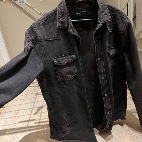Zara denim jakke for herre i blå vask, størrelse L. Jakken er laget i denim og har klassisk jeansjakkesnitt med krage, knappelukking foran og brystlommer med klaff.