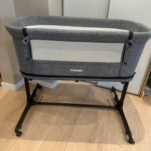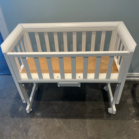 Egnet som babyseng ved siden av foreldreseng. Laget i treverk og leveres med madrass som passer sengens mål, som vist på bildene.