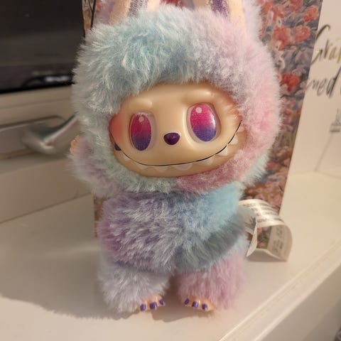 Pop Mart Big Baby Bobo Bunny figur med plysjdrakt i blå farge. Figuren har plastansikt og myk, lodden kropp med kaninører. Leveres i original eske med motiv av figuren. Egnet som samlefigur eller dekorasjon.