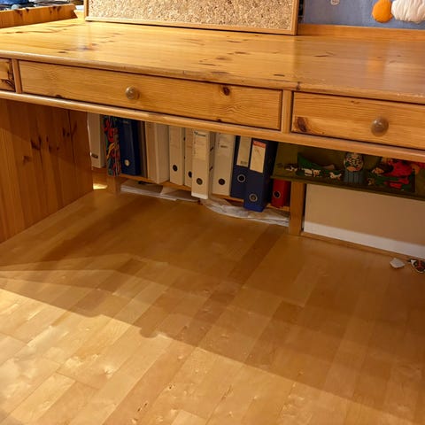 Praktisk og grei skrivepult med tilhørende kommode selges. Overdelen på skrivepulten kan demonteres, skrues i bakkant. Møblene er knapt brukt, kun stått på gjesterom.