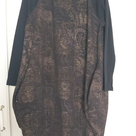 Ahkka tunika for dame i størrelse 40. Plagget er svart med mønstret panel foran i kontrastfarger. Laget i angoraullblanding, med myk og behagelig kvalitet. Tunikaen har rund hals og er knelang med halvlange ermer. Egner seg til hverdagsbruk eller mer pyntede anledninger, og kan brukes både med bukse, tights eller strømpebukse.