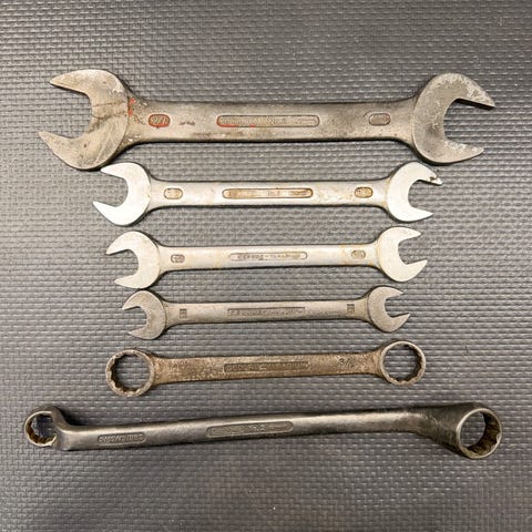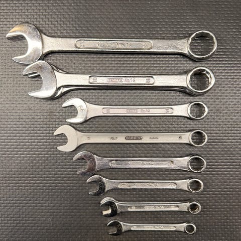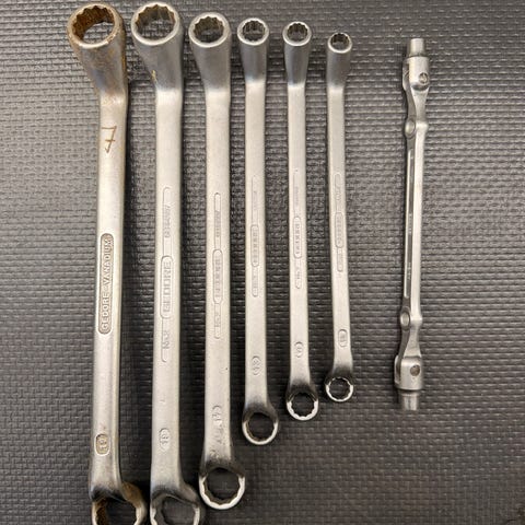 Originale Gedore bøyde ringnøkler i flere størrelser. Tysk krom-vanadium, solide og presise. Brukt med normal slitasje, fullt funksjonelle. Perfekt der rette nøkler ikke kommer til. Selges samlet. Se bilde for tilstand og størrelser. Kan sendes eller hentes.