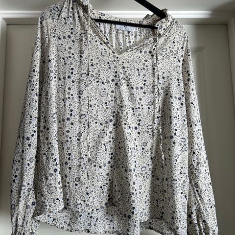 Rue de Femme bluse i flerfarget mønster for dame i størrelse L. Blusen har lange ermer og krage med knyting i halsen. Materialet er viskose, som gir et lett og mykt uttrykk. Passer til hverdagsbruk eller mer pyntede anledninger, og kan kombineres med både bukse og skjørt.