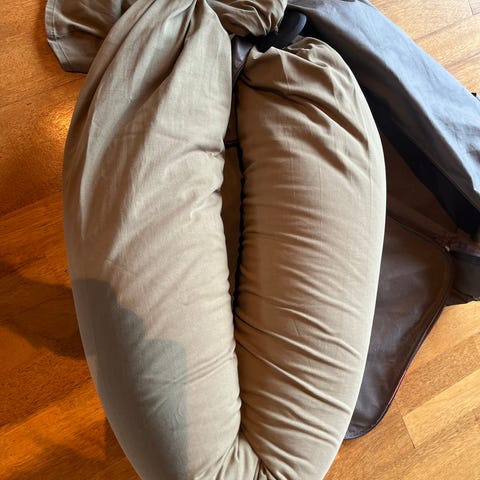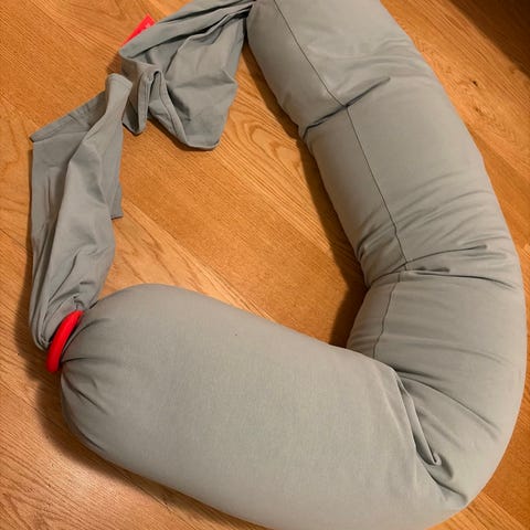 Fantastisk god pute for støtte under graviditet og senere amming. Selges med et ekstra trekk så du alltid kan ha et rent. Fargene på trekkene er blå og lilla, det er ett sett med gule endestykker som brukes for å justere fasthet. Det lange stoffet gjør at puta kan knytes rundt livet ved amming. Denne puta har vært uvurdelig for meg som gravid. Jeg har tre barn, men denne ble kjøpt ny før siste barn.