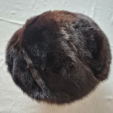Mørk brun minkhatt som har litt mer høyde på ene siden.