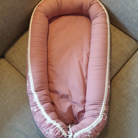 Yngri babynest i rosa farge. Babynestet har myke, polstrede kanter rundt liggeflaten og en avtagbar bøyle/lekeholder med tre myke leker. Leveres med egen bæreveske som gjør det enkelt å ta med seg.