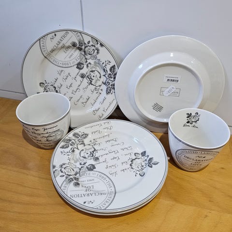 Selger to frokosttallerkener, 2 lattekopper og 2 skåler fra GreenGate Lara Gold serien. Ikke blitt brukt, kun stått til pynt hos oss.