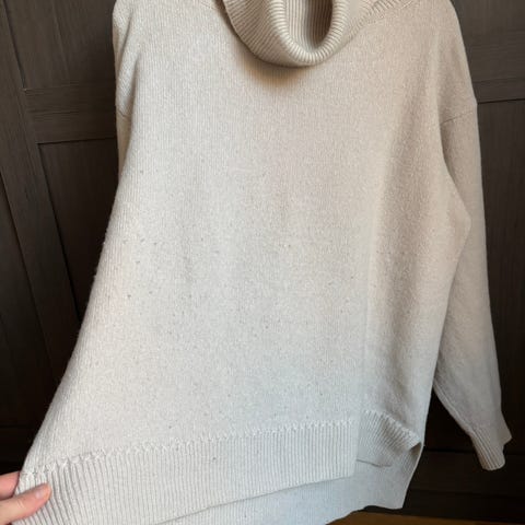 Pent brukt, ingen flekker, hull eller markante nupper. Det står kun håndvask, men jeg har selv god erfaring med maskinvasking på skånsomt ullprogram med kaldt vann.