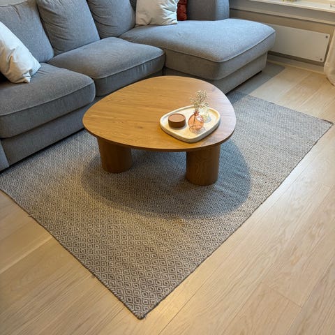 100 % ullteppe i lys grå farge. Grovvevd struktur som gir et nøytralt og rolig uttrykk. Passer inn i mange typer interiør på grunn av den enkle og lyse fargen. 125 x 200 cm. Selges nyvasket. Liten skade i hjørnet som kan sys eller gjemmes under sofa.