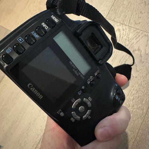 Canon EOS 300D speilreflekskamera med utskiftbart objektiv. Kameraet leveres med objektiv (Canon Zoom Lens EF-S 18-55mm), kameraveske, lite bordstativ, skulderrem, lader, strømkabel og brukermanual. Innebygd blits som kan felles opp ved behov. Passer til generell fotografering som portretter, reiser og hverdagsbruk. Digitalt speilreflekskamera med minnekortplass på siden av kamerahuset.