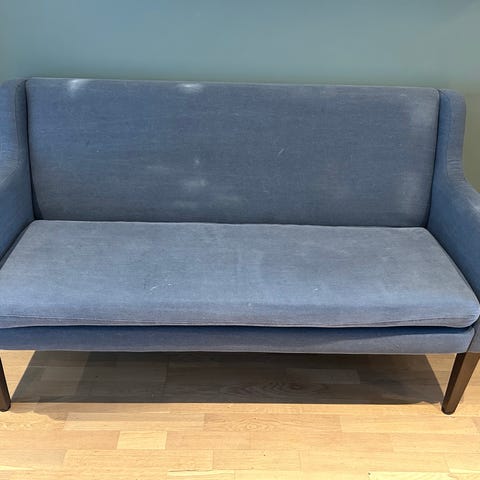 Fin og nett Spisesofa fra H & C (sittehøyde 45/47 med de ekstra knottene vi har satt på). Avtagbart grått trekk som enkelt kan vaskes (vi har hund). Lys eik understell. Noe nedsittet i madrassen. Lett å frakte, veier ikke mye.