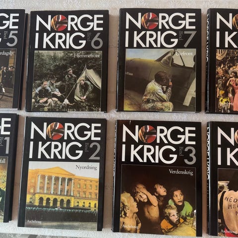 Norges Krig 1940–45 bokverk i 3 bind. Bøkene har brune permer med gullfarget skrift på ryggen.