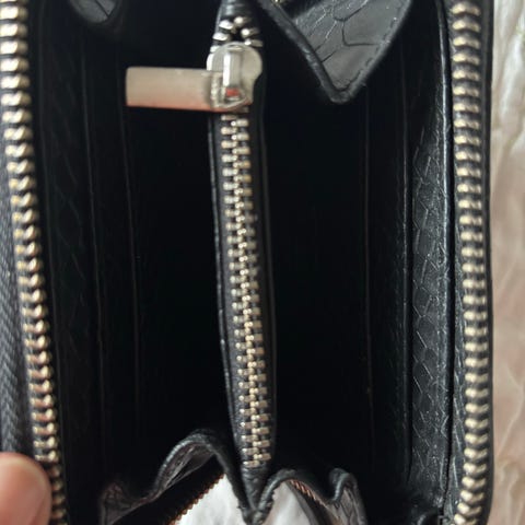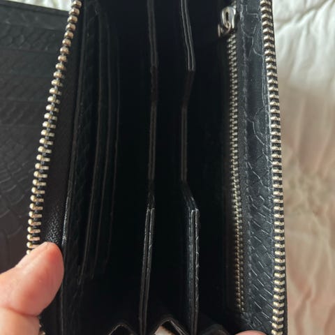 Markberg lommebok i svart lær ! Lommeboken har preget overflate med mønster, klaff med trykknapp og eget rom med glidelås. Innvendig er det flere rom som egner seg til kort, sedler og småting. Passer som kompakt hverdagslommebok som får plass i de fleste vesker.