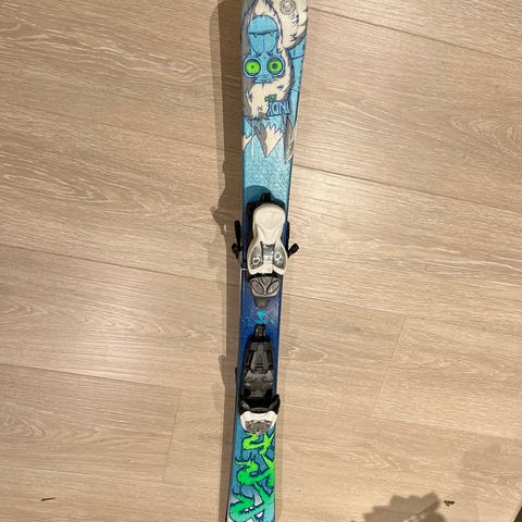 K2 Indy alpinski i lengde 124 cm. Twintip-inspirert barn/ungdomsmodell med markant grafikk på oversiden. Sålen har synlige riper, se bilder for detaljert tilstand. Passer til alpinbruk i bakke. Bindinger er montert på skiene; eksakt modell og innstillingsområde er ikke spesifisert.