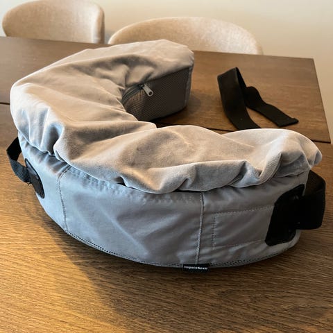 Cozyfix ammepute i beige og svart. Puten har buet fasong som legges rundt kroppen og festes med justerbar stropp. Yttermaterialet består av myk, beige overflate på oversiden og svart stoff på undersiden og sidene. Egnet som støtte ved amming eller flaskemating, og kan gi stabil og ergonomisk posisjon for både voksen og barn. Kan også brukes som støttepute ved sitting eller hvile.