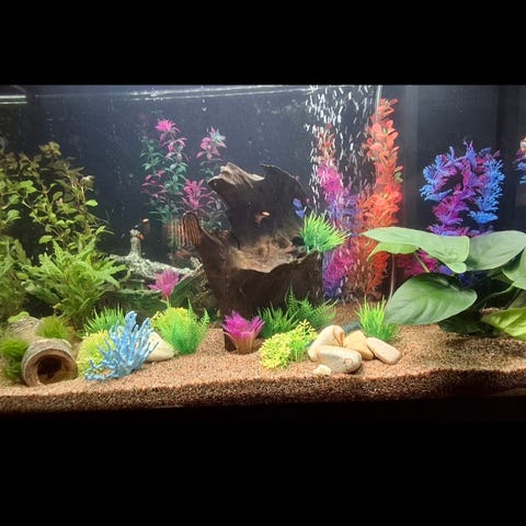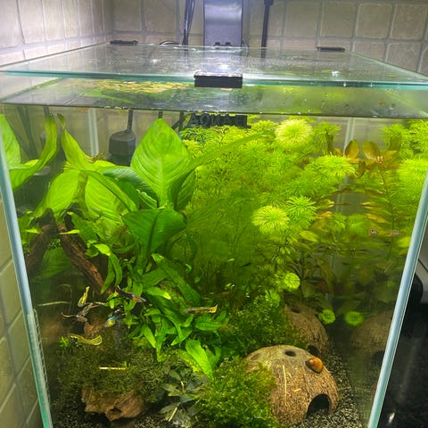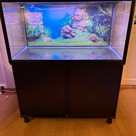 Det som følger med er for.eks 2x lys i armatur, lokk, sand og noe dekorasjon, huler og steiner om ønskelig.