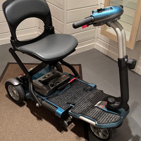 Elektrisk mobilitetsscooter med fire hjul i blå farge. Scooteren har polstret sete med ryggstøtte og nedfellbare armlener. Foran er det et styre med kontrollpanel og håndtak, samt en avtakbar kurv for oppbevaring. Fotbrettet er flatt og sklisikkert. Egnet som hjelpemiddel for personer med nedsatt mobilitet til bruk innendørs og utendørs på jevnt underlag.