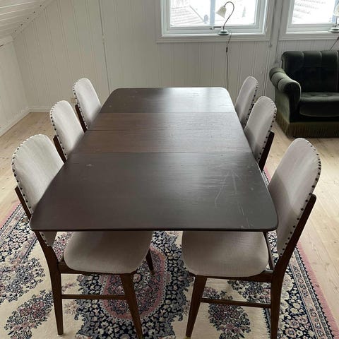 Veldig fin spise-gruppe selges samlet for en rimelig penge. (finner ingen merke/designer på møbelet)