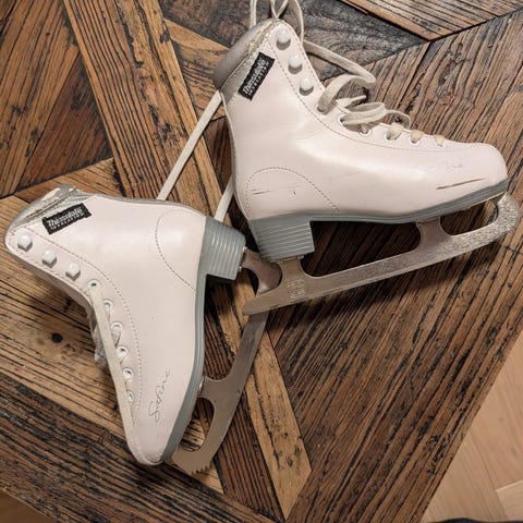 Pent brukte skøyter. Hvite med snøring foran. Merke: «Dansette»