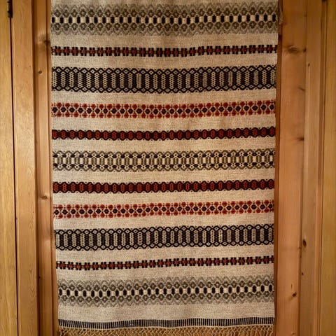 Veggteppe i ull med geometrisk mønster i grønn-, grå-, hvit- og sorte toner. Teppet har rektangulær form og er vevd med tydelige trappeformer og korsmotiv i midten. Øverst er det oppheng i smijern med dekorative detaljer, som gjør det enkelt å henge teppet på veggen. Egner seg som veggdekor i stue, gang eller andre oppholdsrom. Mål 42x 125 m/frynser.
