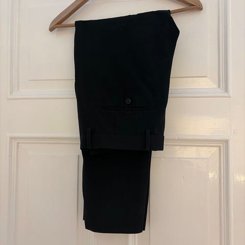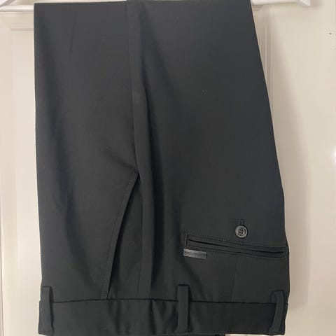 Dressmann bukser for herre i størrelse M. Buksene er svarte og laget i polyester. Klassisk modell med rette ben, glidelås og knapp i front. Egnet som penbukse eller til hverdagsbruk der det ønskes en enkel og nøytral svart bukse i polyester.