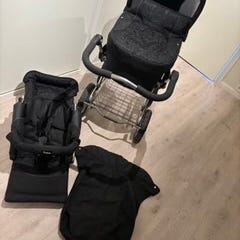 ~ Vognen har liggedel med polstret innside og matchende trekk i grått tekstil.