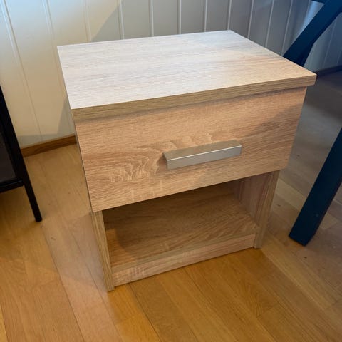 Kommode med to skuffer. Kommoden er i tre-finer med et steinuttrykk på sidene. Kommoden er i god stand, og har stått på ungdomsrommet. Skuffene åpnes med et trykk. Usikker på hvor kommoden opprinnelig kommer fra.