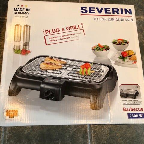 Severin Senoa Boost bordgrill er en elektrisk grill beregnet for bruk på bord eller benk. Modellen har en kompakt utforming med grillrist og kontrollhjul for regulering av varme. Grillen er egnet til grilling av kjøtt, fisk, grønnsaker og andre matvarer i mindre husholdninger eller der det er begrenset plass til tradisjonell grill. Kan brukes både innendørs der det er tillatt og utendørs på balkong, terrasse eller lignende, avhengig av lokale regler og produsentens anvisninger. Åpnet aldri brukt