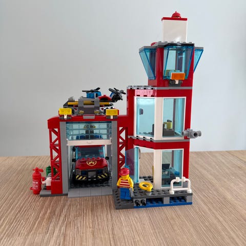 LEGO City brannstasjon byggesett. Settet består av en brannstasjon med flere bygninger og kjøreporter, tak med helikopterplass-lignende flater, tårn med flagg og diverse tilbehør som trær og små detaljer. Modellen har plass til brannbiler i garasjene og har åpne områder for lek både foran og bak bygningen. Passer som byggesett for barn som liker by- og utrykningstema i LEGO City-serien.