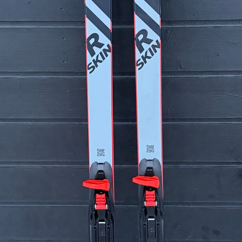 Pent brukte ski for barn med smørefri såle med mønster under. Skiene har Rottefella-bindinger.