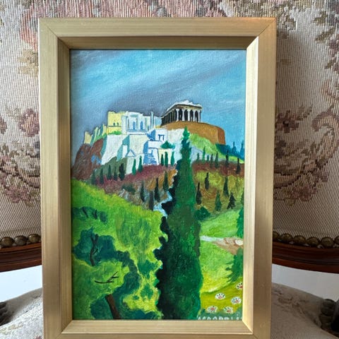 Maleriet er signert nede i venstre hjørne (se bilde). Leveres i solid hvit ramme med gullfarget innerkant. Bildet fremstår i god stand, med normale bruksspor på ramme.