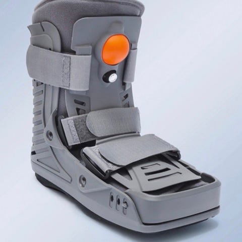 Aircast Air-Stirrup Universe ankelstøtte. Universell ankelortose med stive plastskinner på hver side av ankelen og luftpolstrede puter på innsiden. Festes med justerbare borrelåsremmer rundt legg og ankel, samt stropp under foten for stabil plassering. Egnet som støtte og stabilisering av ankelleddet ved behov for avlastning eller kontrollert bevegelse.