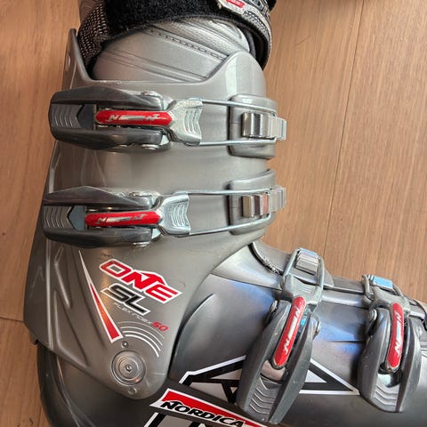 Nordica Olympia Triumph alpinstøvler i str 25 (tilsvarer str 39-40) i svart/grå farge. Støvlene har fire justerbare spenner i metall og powerstrap øverst for bedre tilpasning rundt leggen.