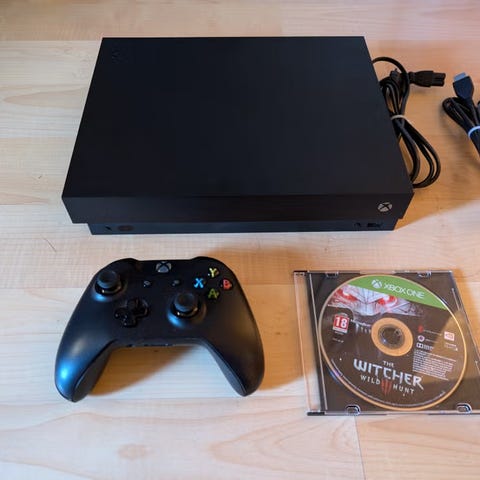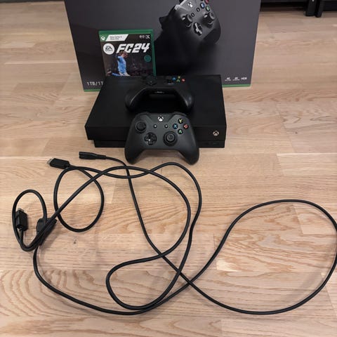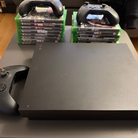 Xbox One X med to kontrollere, svært lite brukt. Spill inkludert: Red Dead Redemption og Forza Horizon 4.