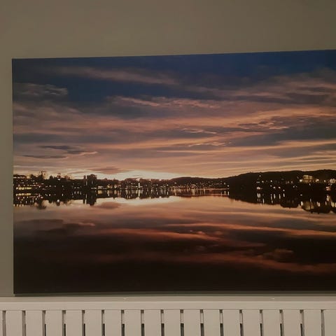 Fotografi veggbilde som viser en solnedgang over vann og fjell, med silhuetter av trær i forgrunnen. Bildet har hovedsakelig blå og oransje toner. Motiv egner seg som veggdekor i stue, soverom, gang eller kontor. Kvadratisk format, montert som bilde klart til oppheng på vegg.Bildet måler 50 ganger 50