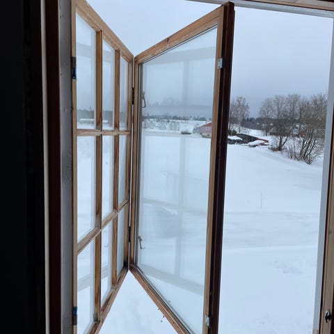 Vinduet har to sidehengslede vindusfløyer med sprosser og klart glass. Den innerste delen av det koblede vinduet har 2 lags glass og ikke ruter.