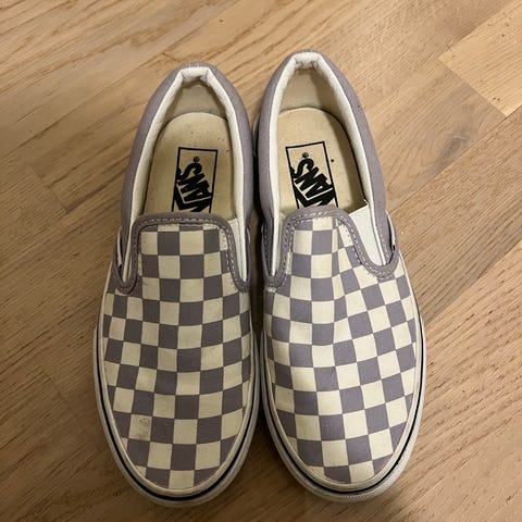 Vans Classic Slip-On sneakers i størrelse 38. Modellen er slip-on uten lisser, med klassisk rutemønster i gul og hvit. Overdel i tekstil og vulkanisert gummisåle med karakteristisk waffle-mønster. Egnet som fritids- og hverdagssko.